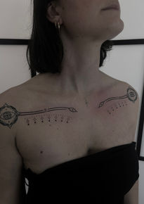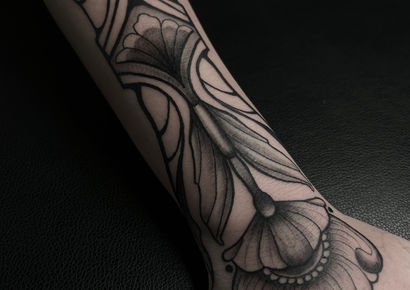 Ronja tätowiert sowohl in Farbe als auch in Black and Grey, am liebsten illustrativ, Blackwork und Traditional. Spannend findet sie unter anderem die Kombination aus psychedelischen Mustern und Art Nouveau. Neben dem klassischen Tätowieren mit der Maschine arbeitet sie auch gern mit der traditionellen Handpoke-Methode.